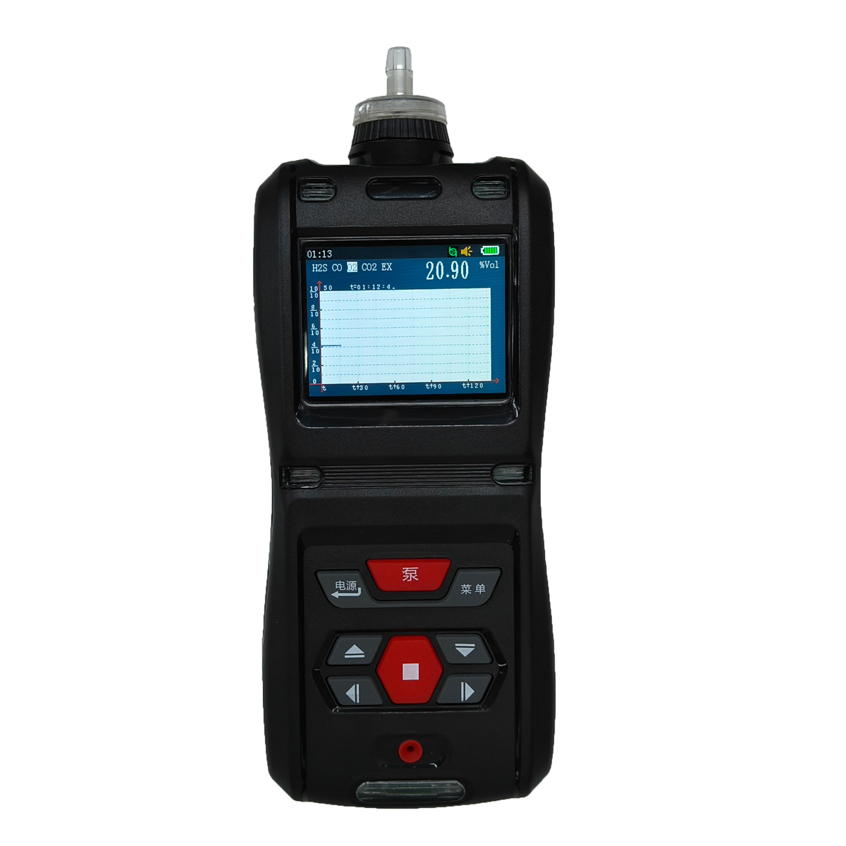 ◆界面显示:气体名称、实时浓度值、气体单位;时间、气泵工作状态(风扇图标)、声音、电池电量等图标。
